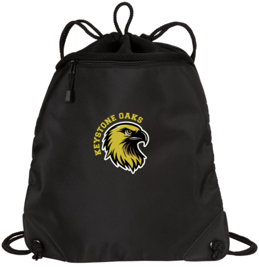 Just right for the beach or by the pool this large cinch pack will easily hold shoes or a change of clothes. 100% polyester microfiber on the front 100% polyester air mesh above pocket and on the back Breathable air mesh above pocket and on back Front zippered pocket Drawcord closure Reinforced bottom grommets Dimensions: 18'h x 14.5'w Note: